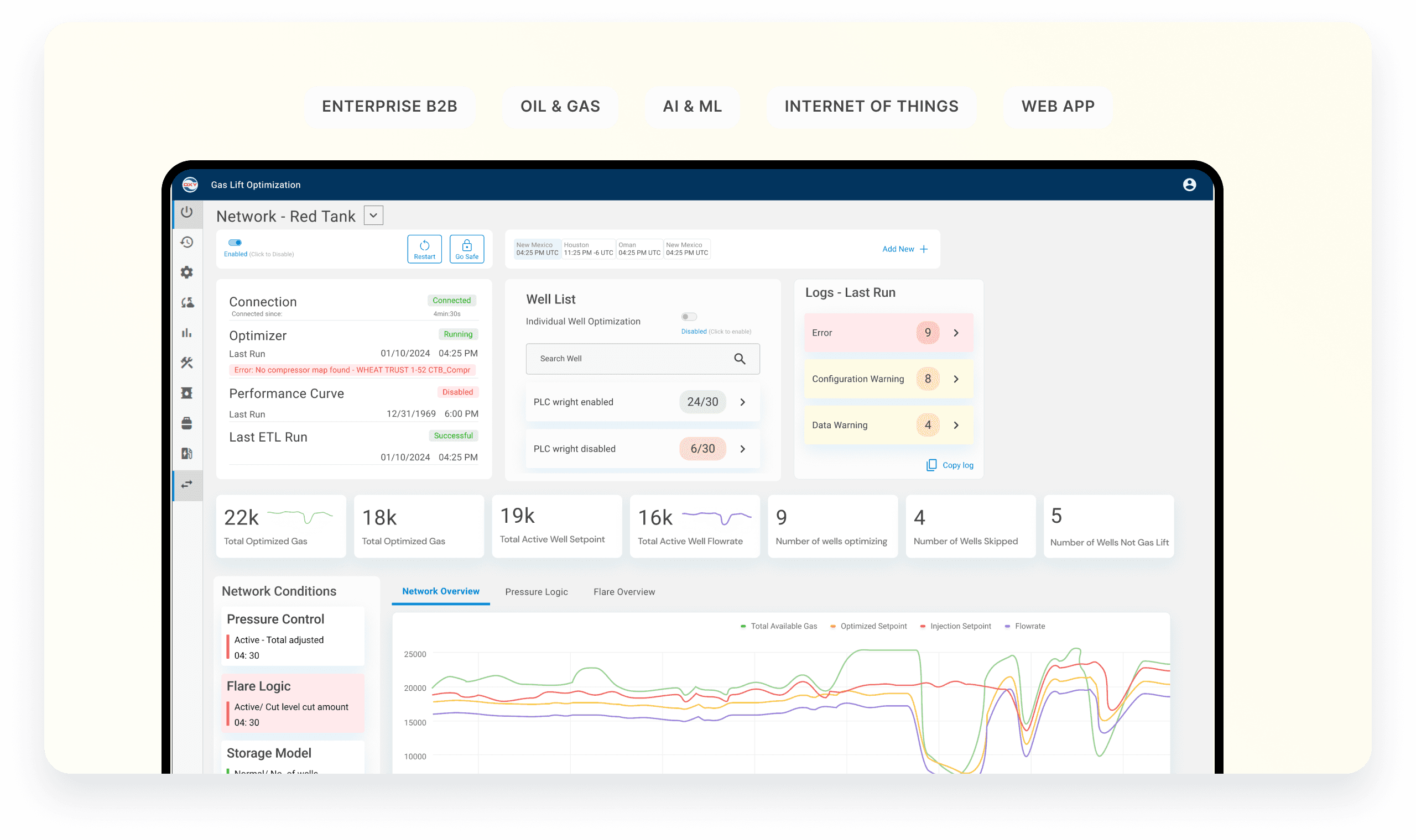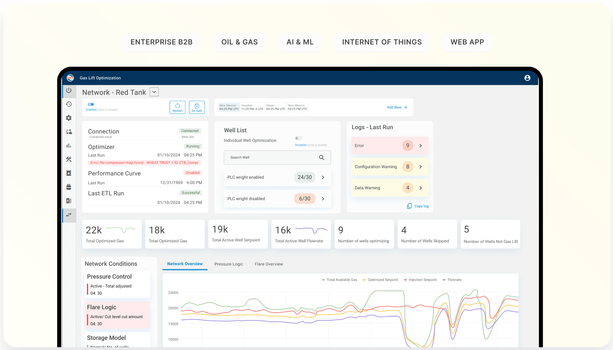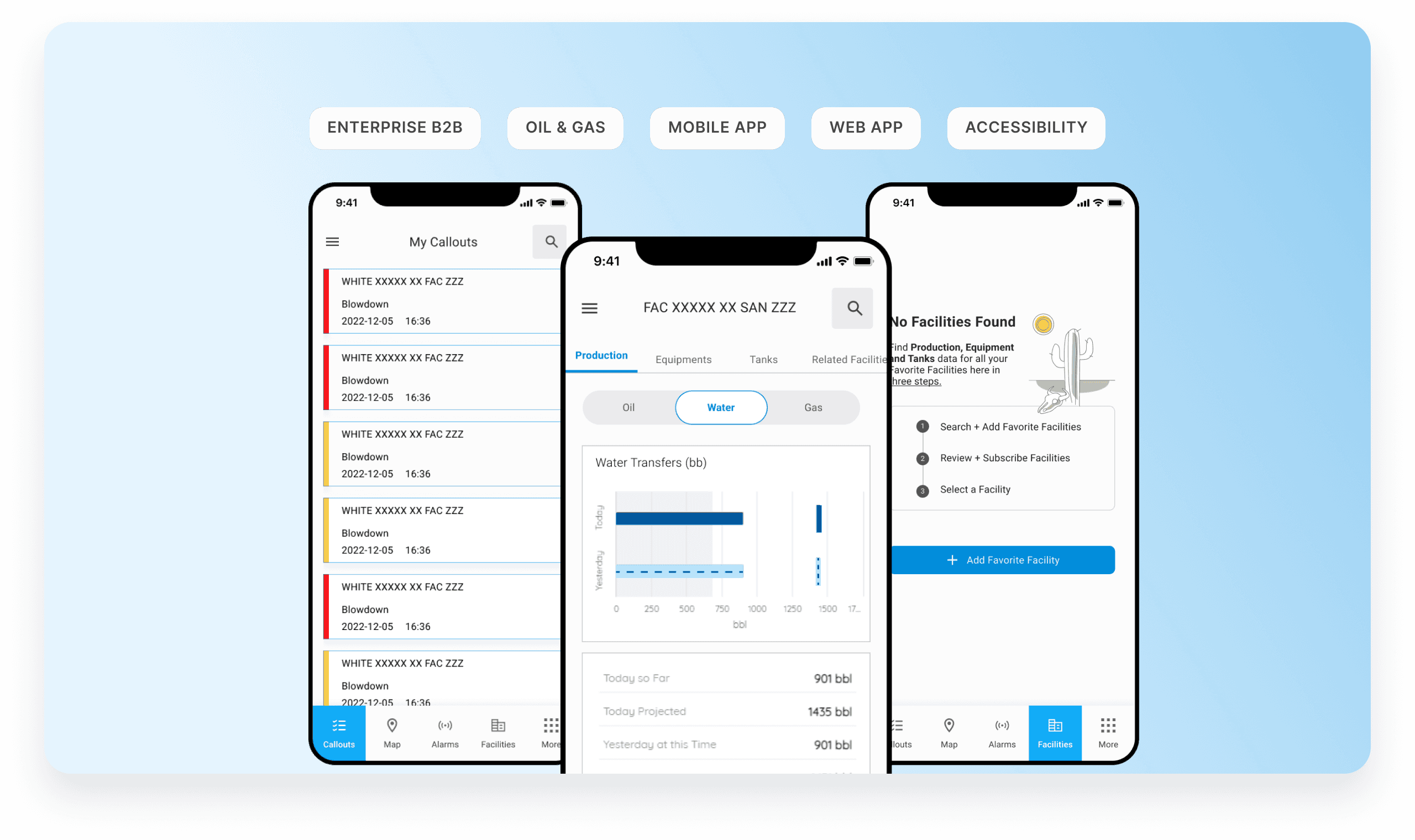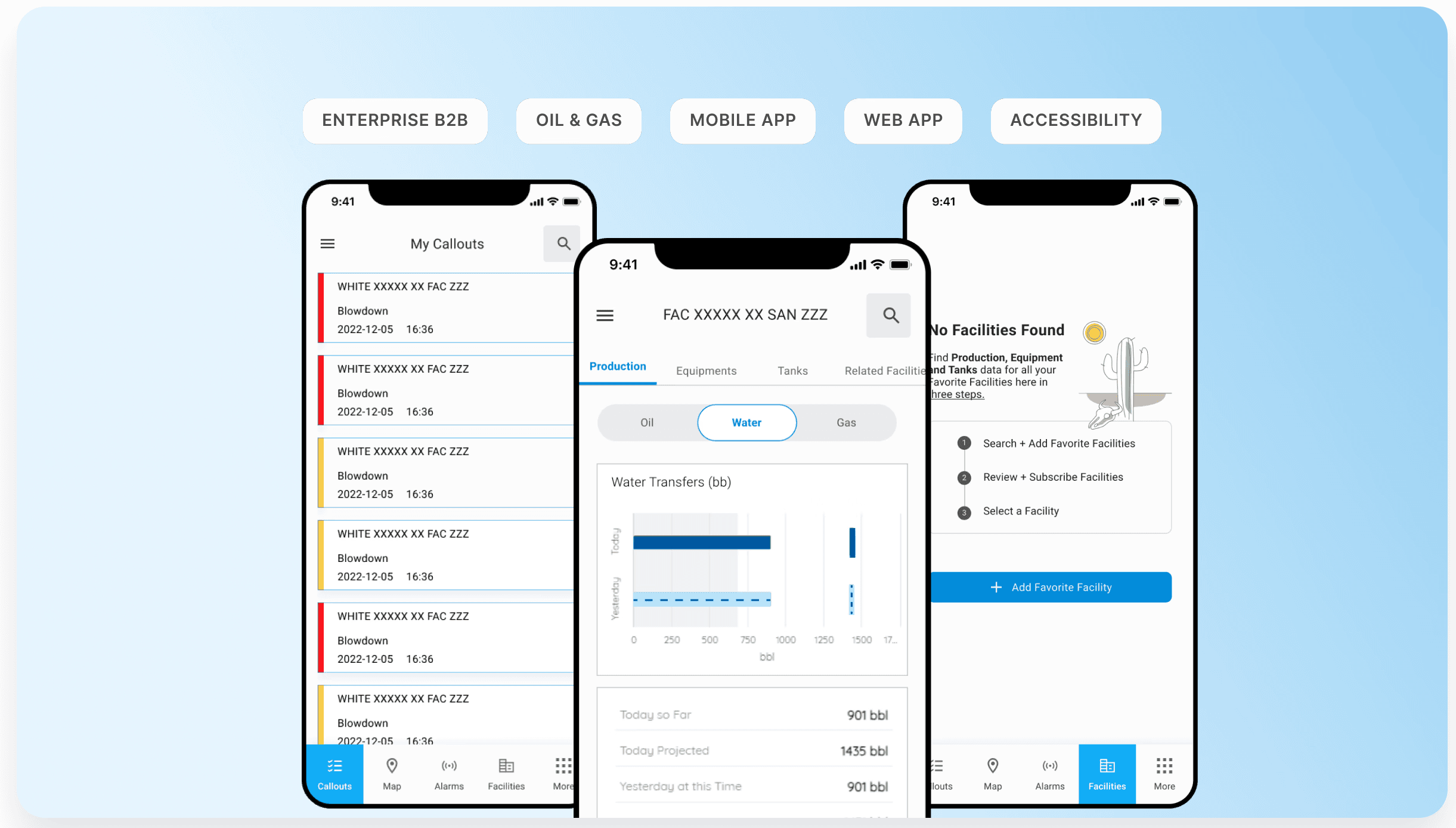 Led UX for a suite of IoT monitoring tools tracking real-time field operations. Created component libraries, data visualization patterns, and WCAG 2.1 AA compliant interfaces