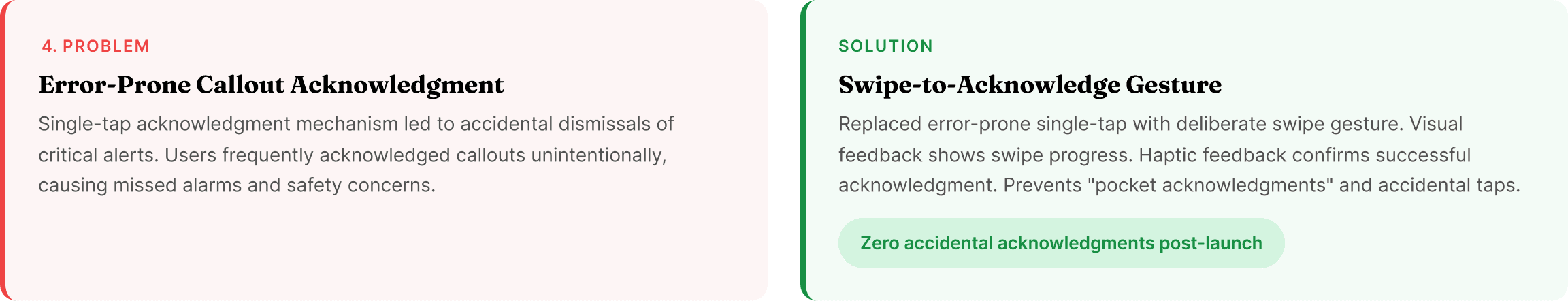 In safety-critical contexts, preventing errors is more important than speed. The swipe-to-acknowledge gesture added friction intentionally—