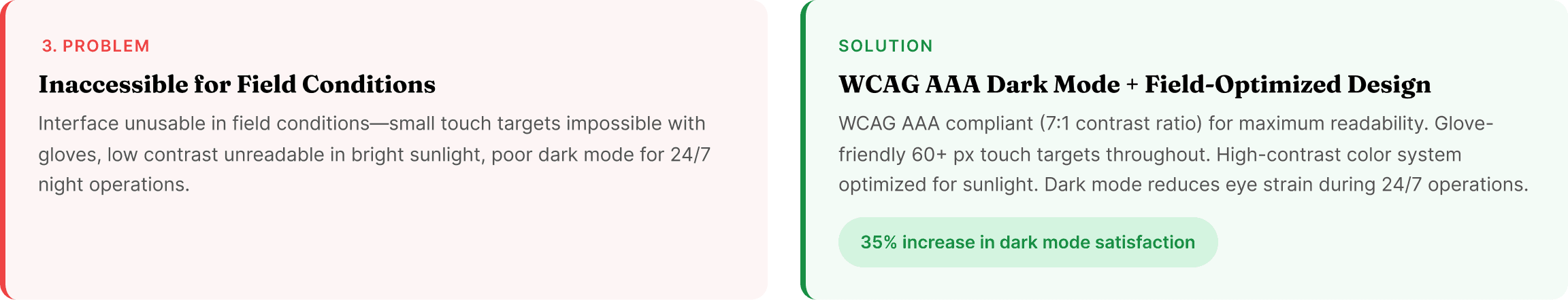 WCAG AAA compliance wasn't just about meeting standards—it was about operational effectiveness. High contrast = readable in sunlight.