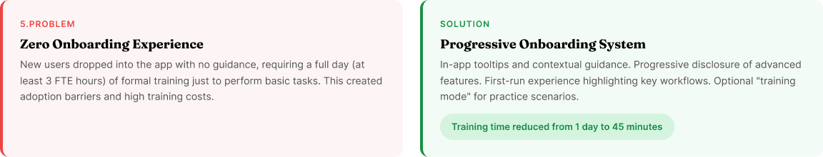 Progressive onboarding reduced training time by 70% and accelerated time-to-productivity for new users. The investment in onboarding