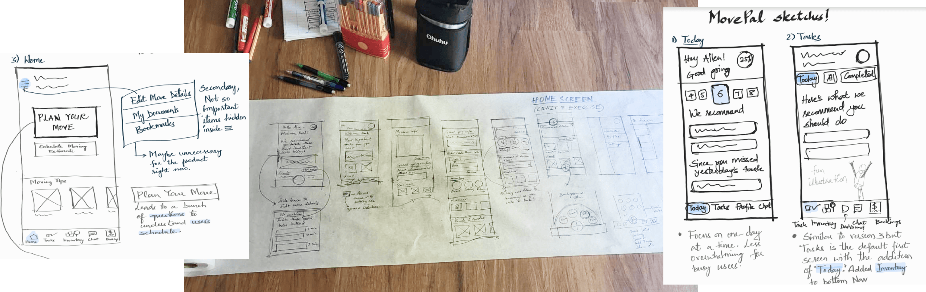 After brainstorming and a few dozen sketches later, I thought the “Tasks” screen should be the default screen as that is the most important function of the application.